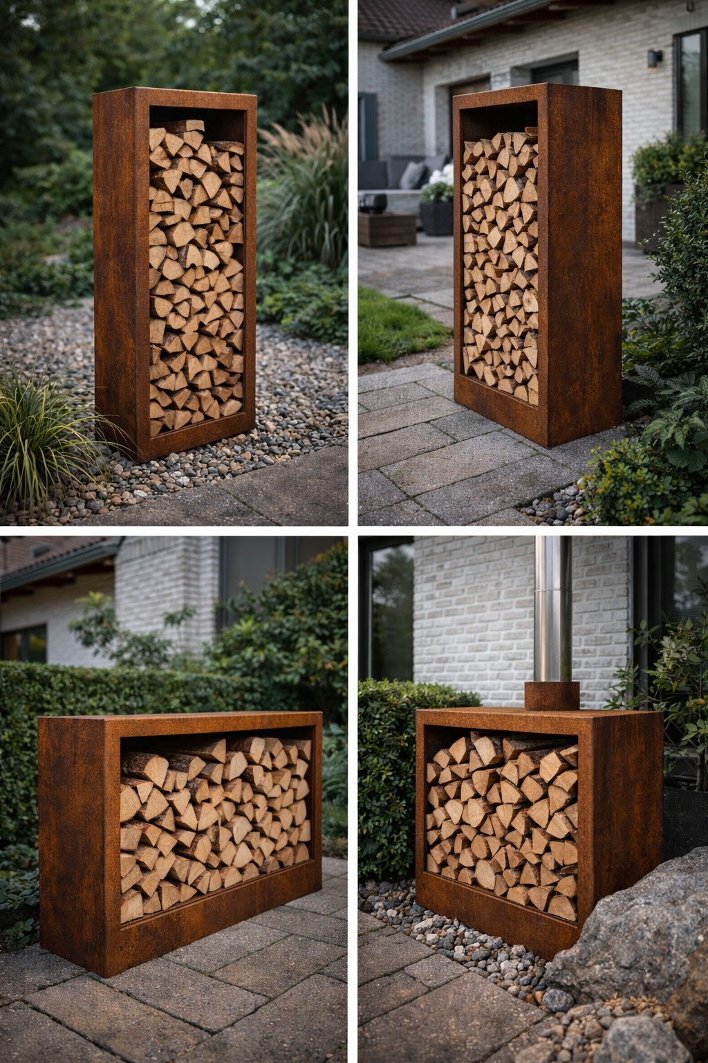 Corten plienas natūraliai formuoja apsauginę patiną, todėl kiekviena malkinė įgauna savitą