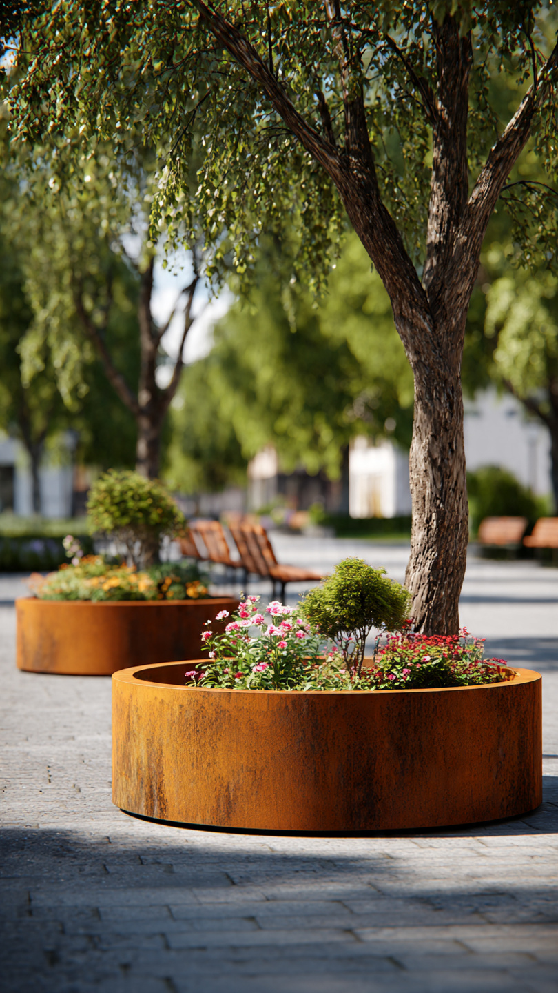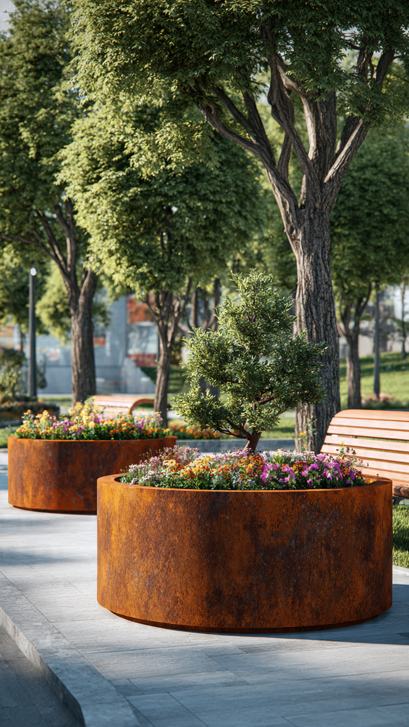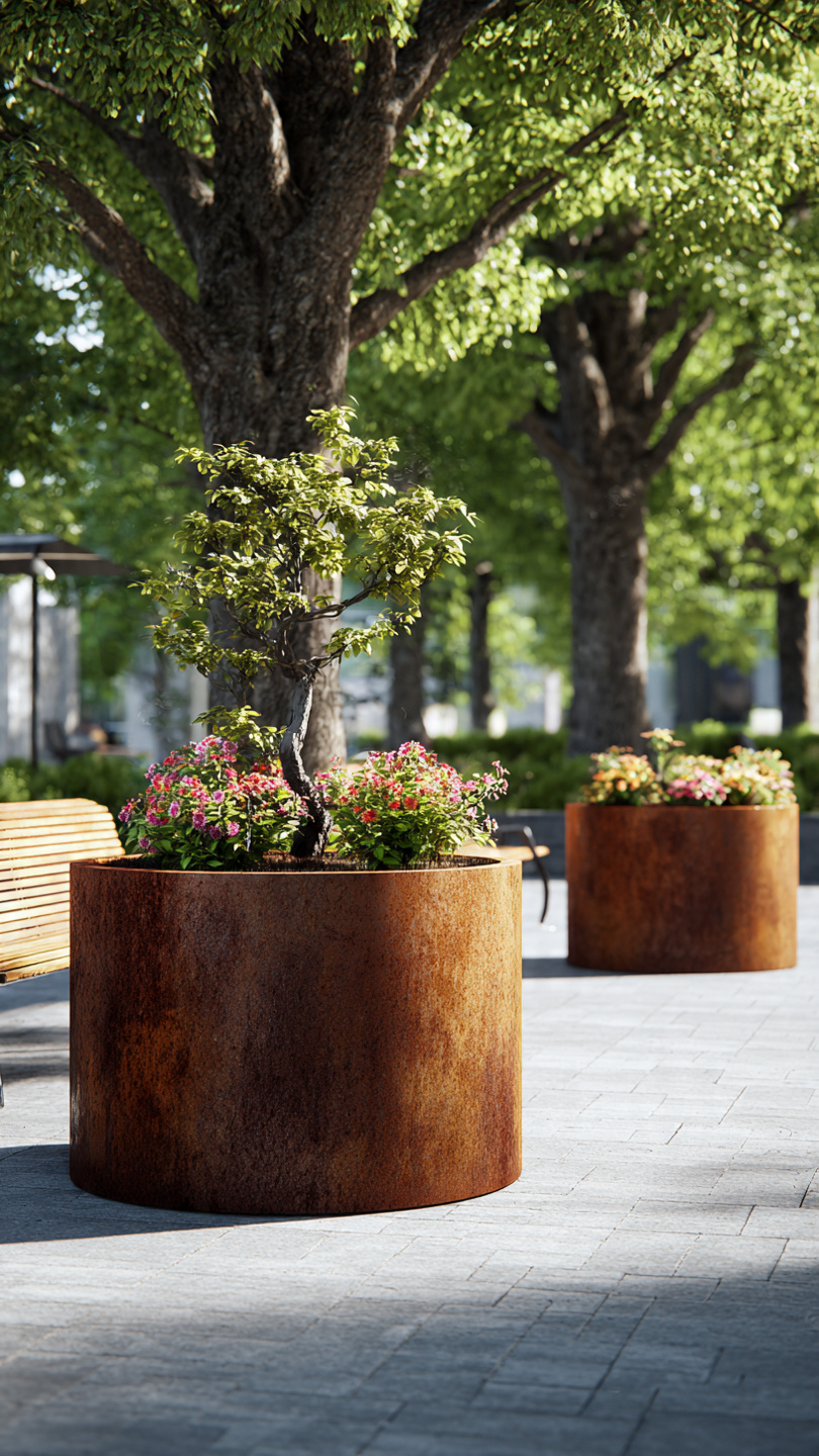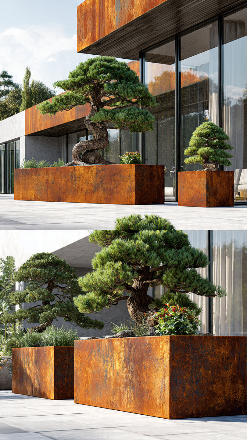 Corten plieno vazonai natūraliai įsilieja į aplinką. Jų žemiškas atspalvis puikiai dera su: