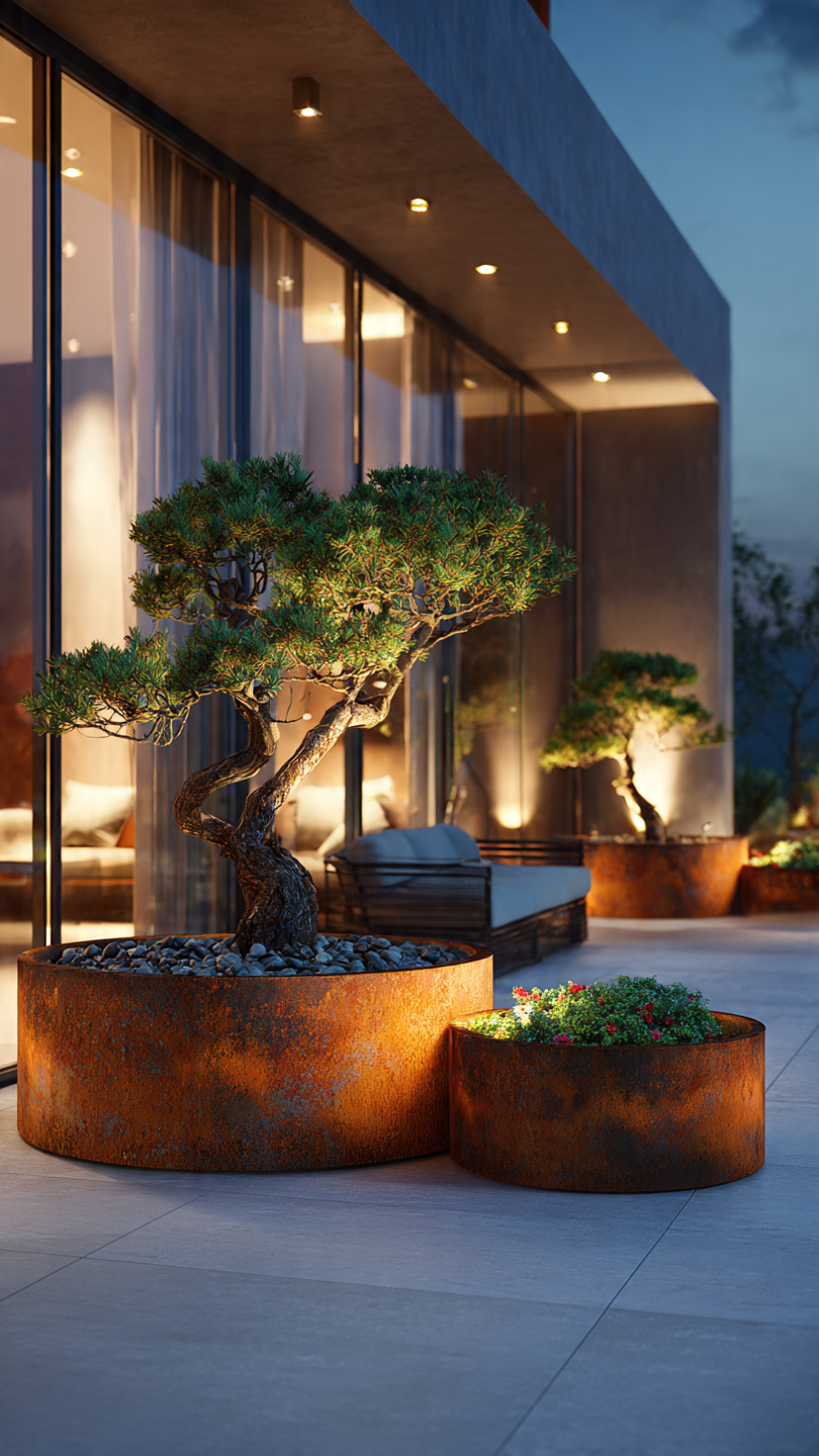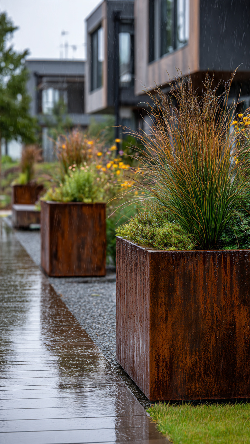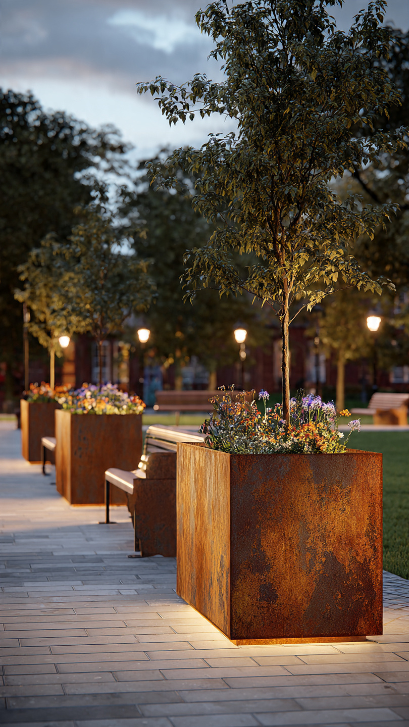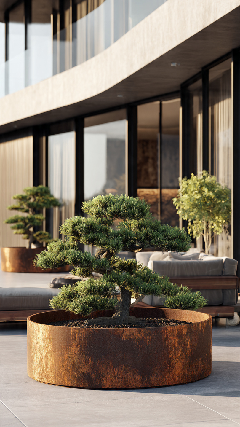 Corten plieno vazonai natūraliai įsilieja į aplinką. Jų žemiškas atspalvis puikiai dera su: