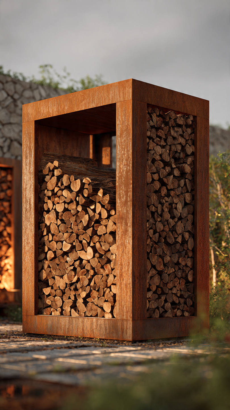Corten plienas natūraliai formuoja apsauginę patiną, todėl kiekviena malkinė įgauna savitą