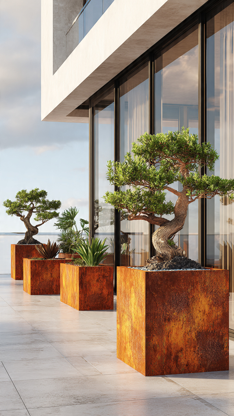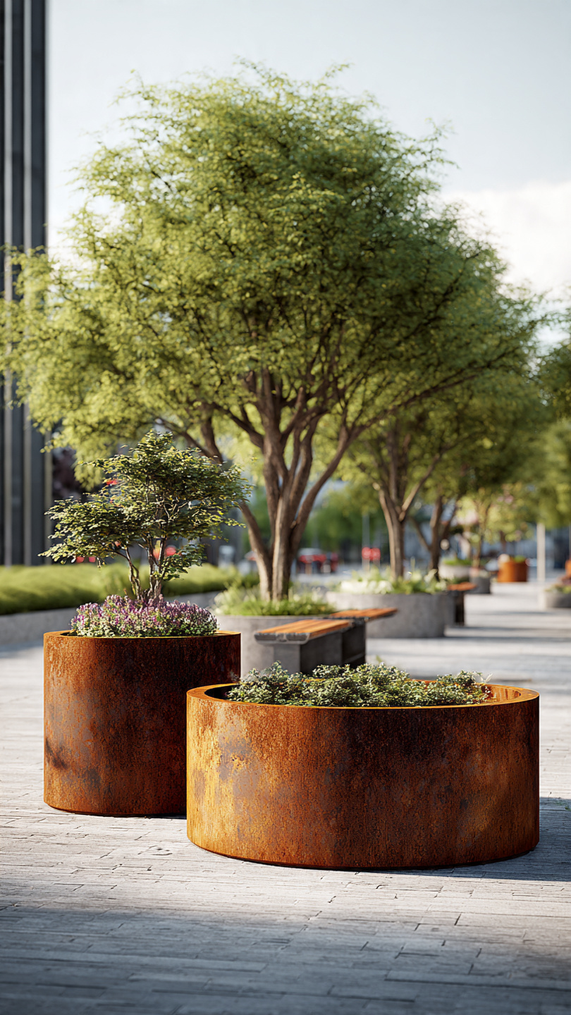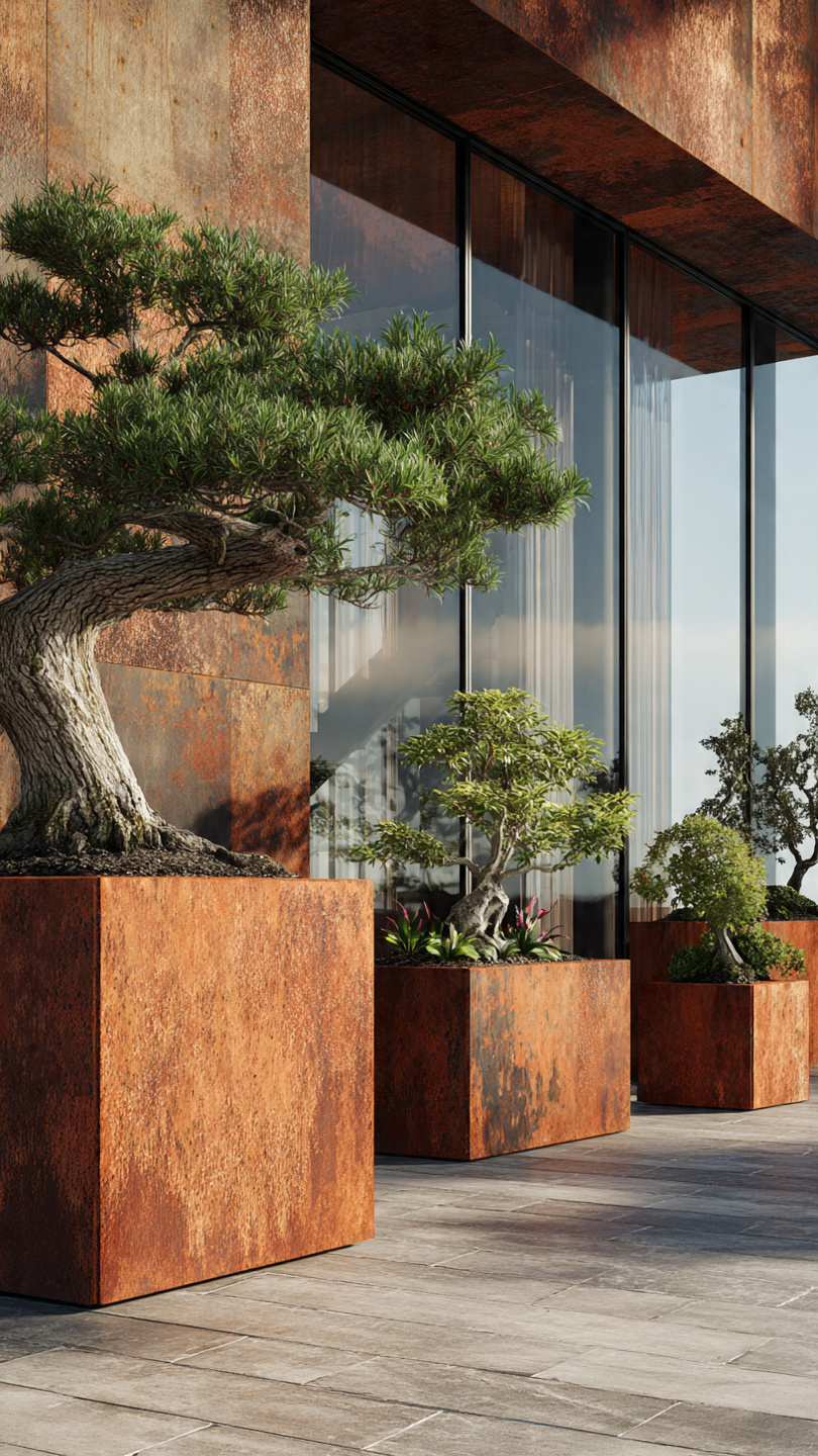 Corten plieno vazonai natūraliai įsilieja į aplinką. Jų žemiškas atspalvis puikiai dera su: