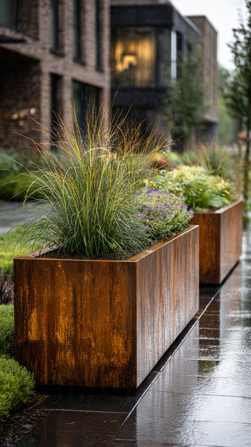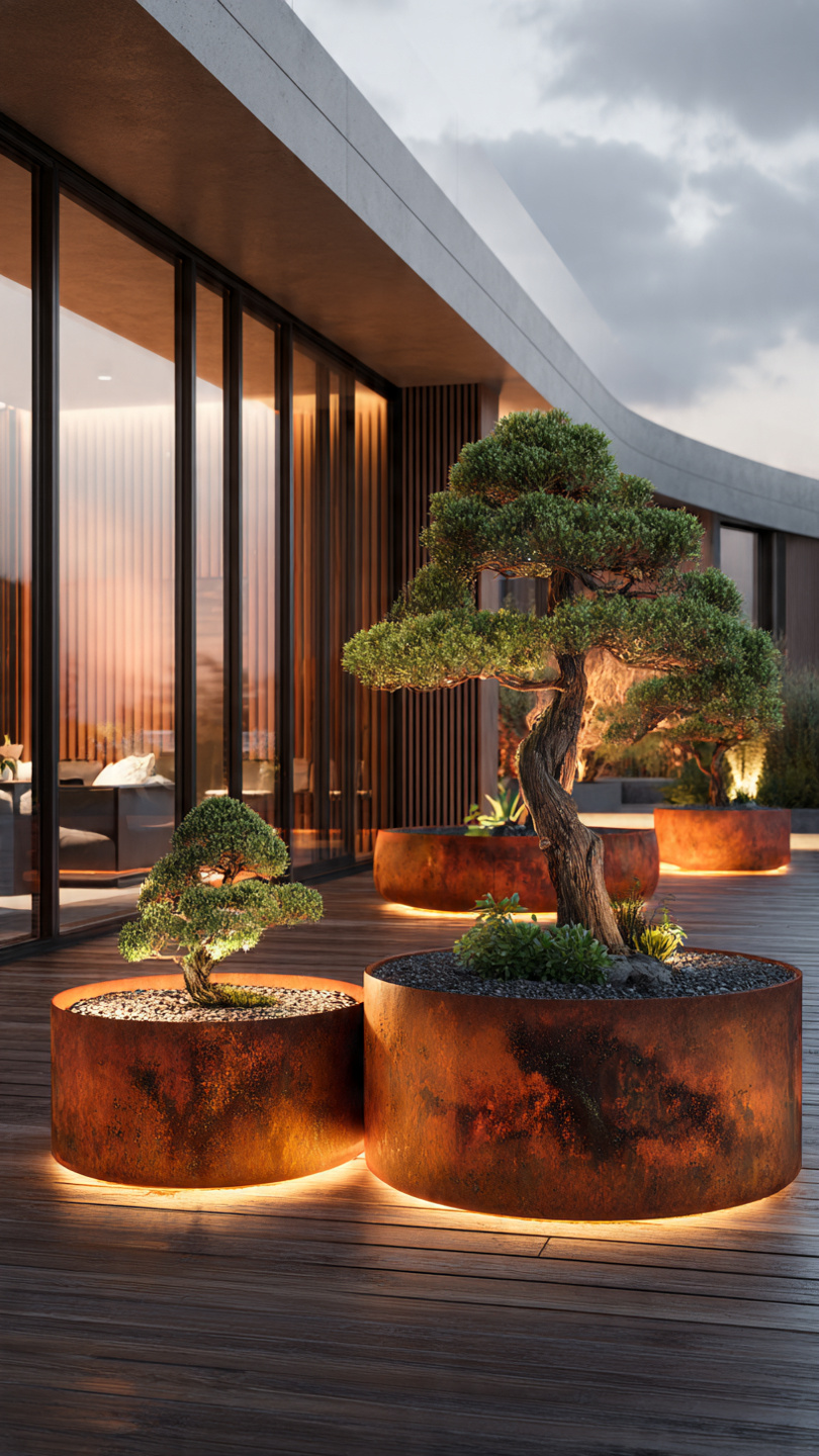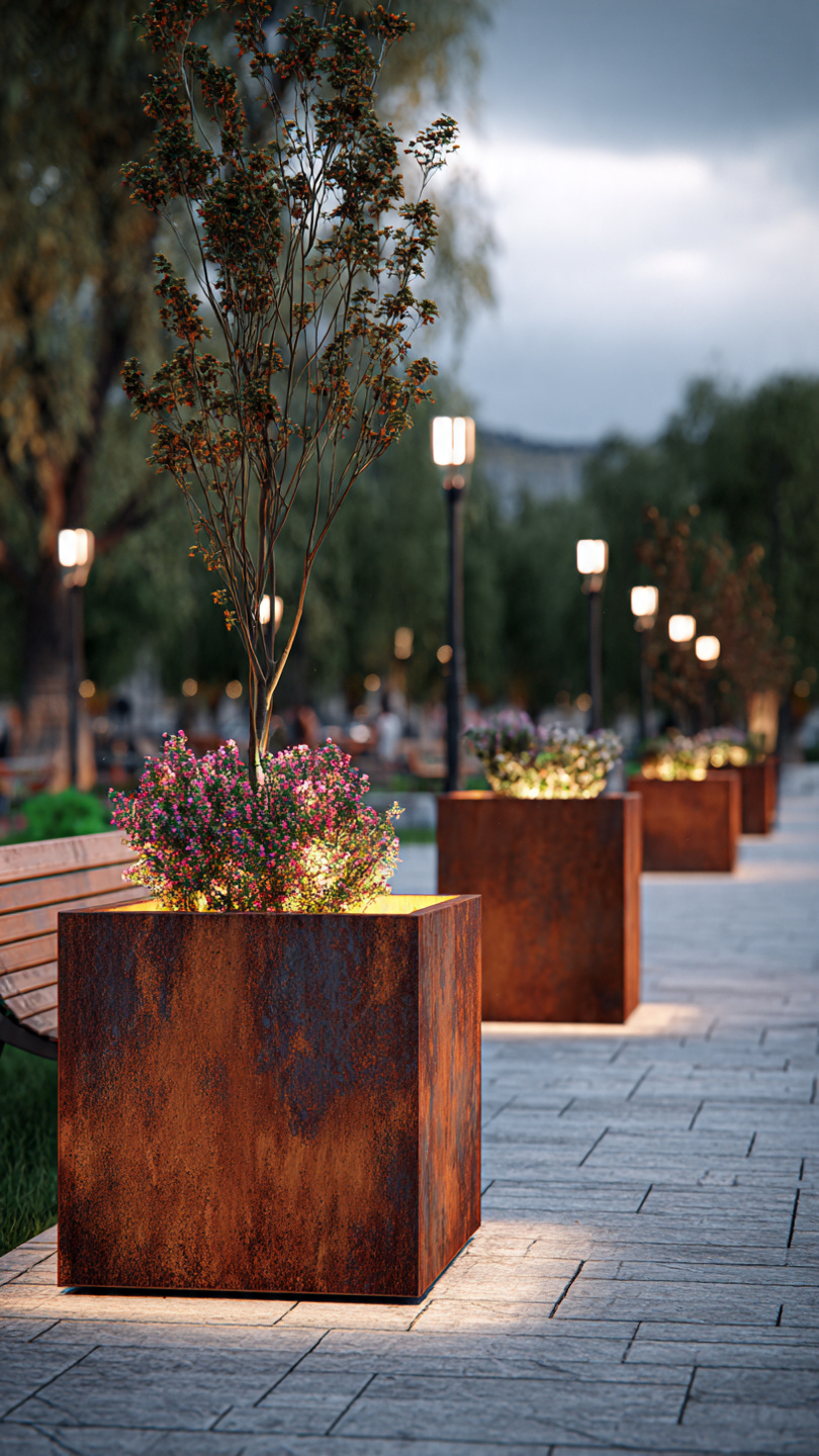 Corten plieno vazonai natūraliai įsilieja į aplinką. Jų žemiškas atspalvis puikiai dera su: